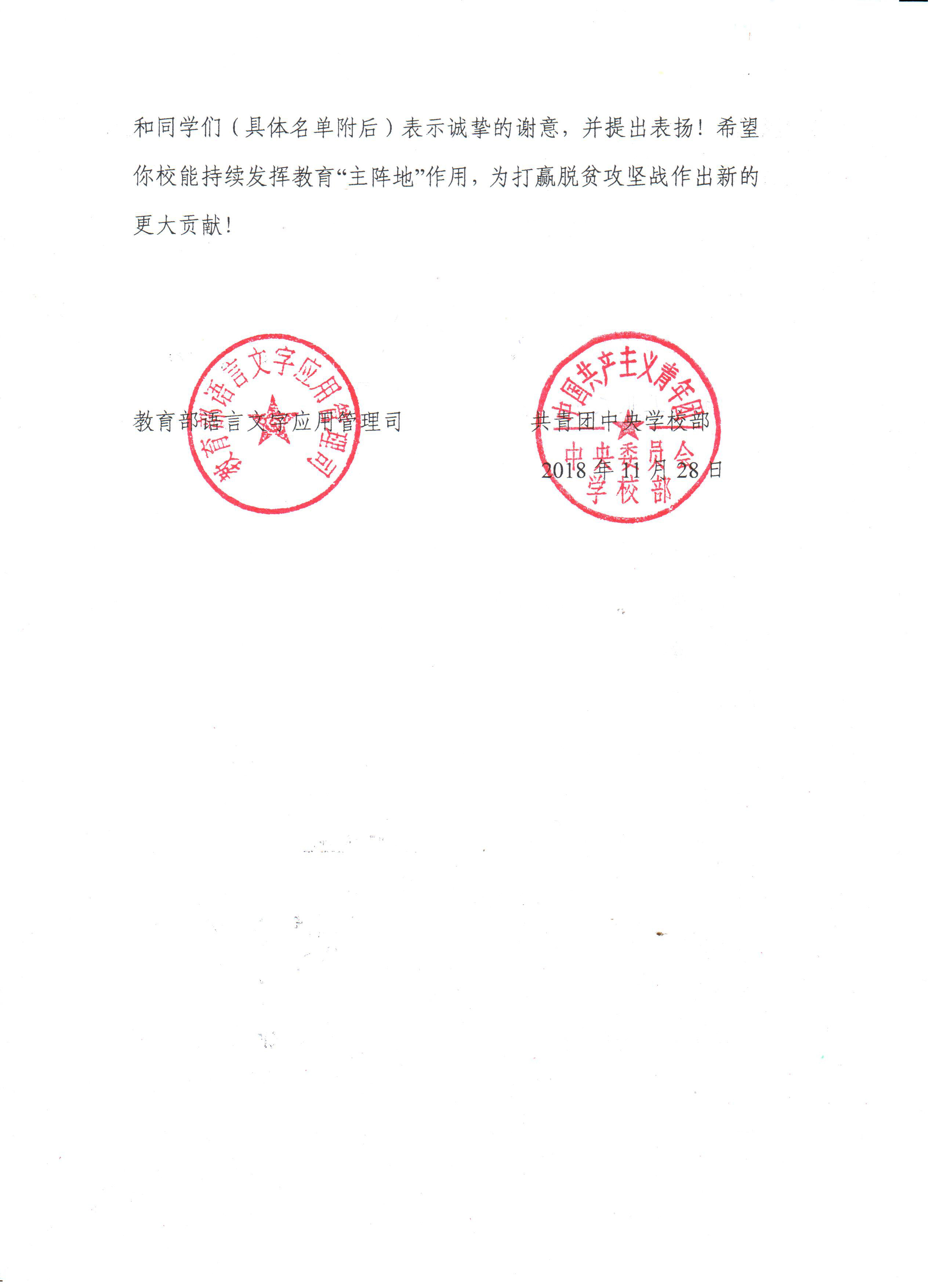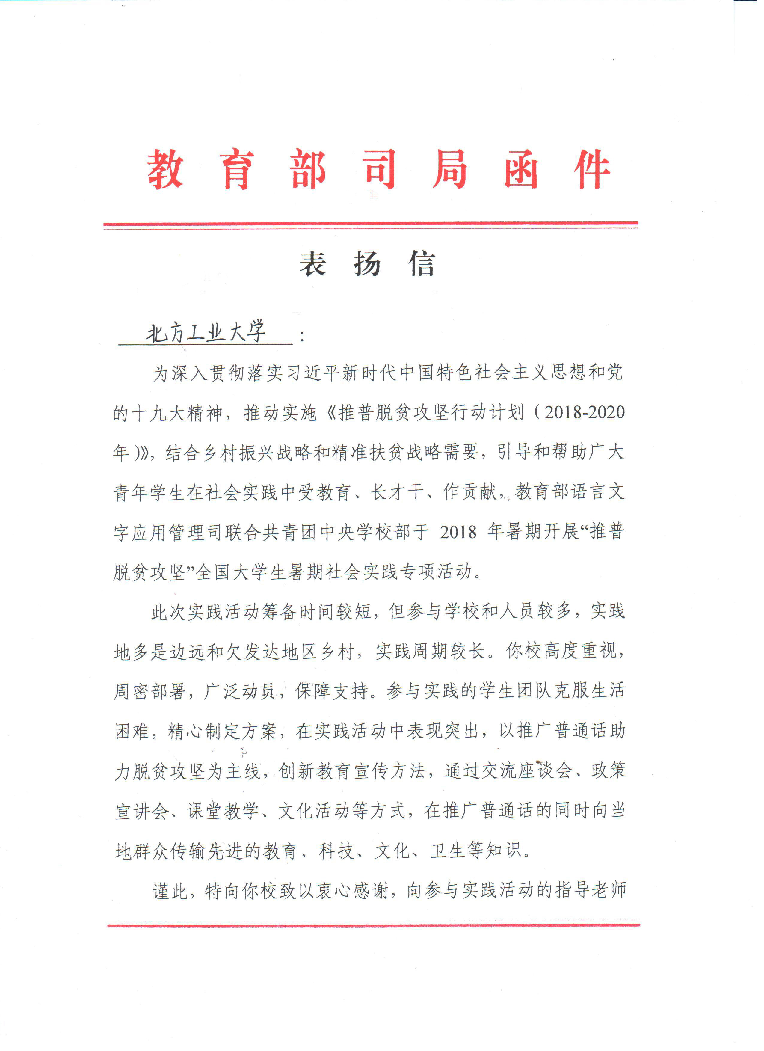 近日,学校收到教育部语言文字应用管理司和团中央学校部发来的表扬信,对威尼斯官网参加2018年“推普脱贫攻坚”全国大学生暑期社会实践的优秀团队提出表扬。