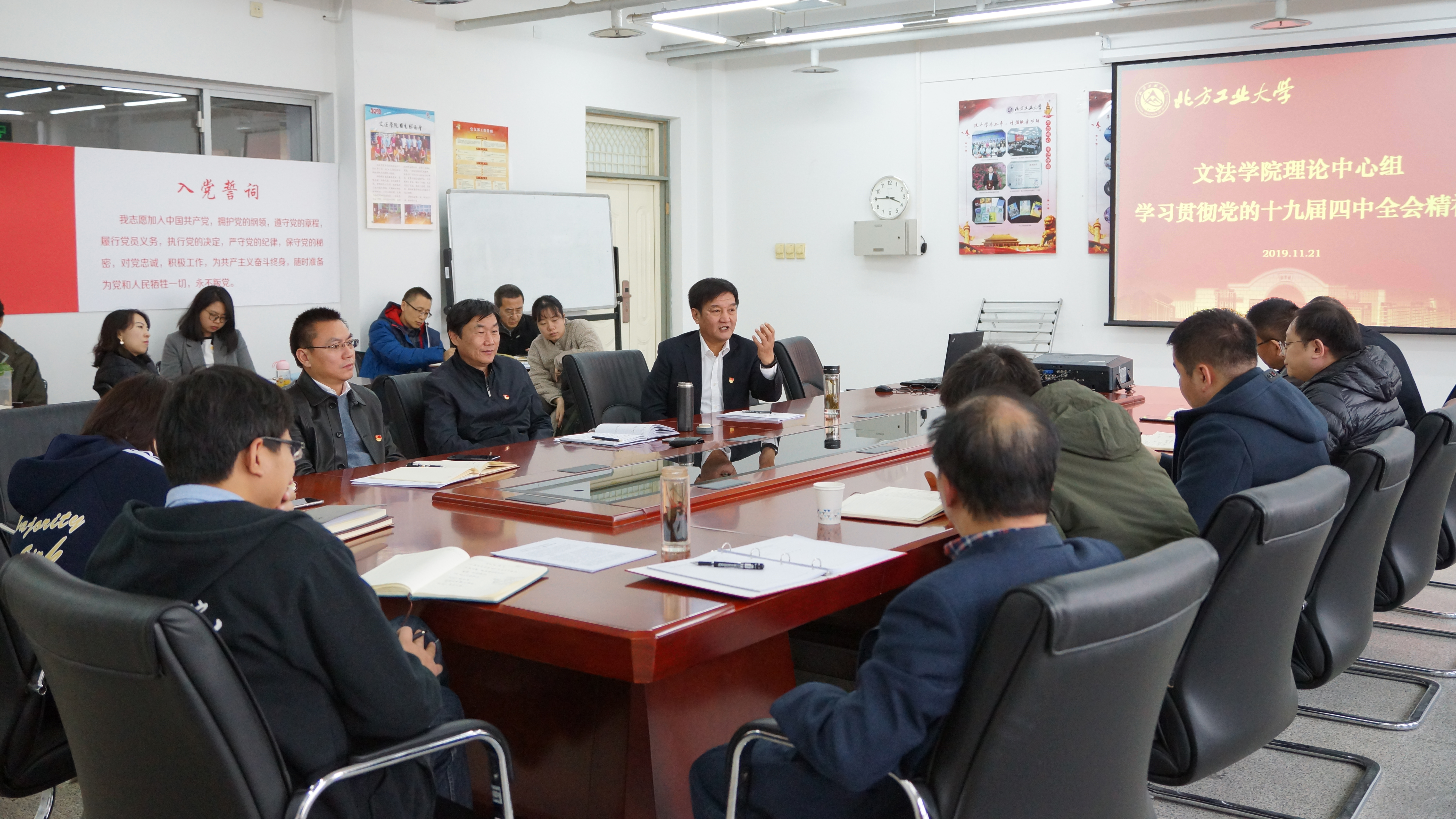 会上,刘泽军院长带领大家一起学习了《中国共产党第十九届中央委员会第四次全体会议公报》和《中共中央关于坚持和完善中国特色社会主义制度、推进国家治理体系和治理能力现代化若干重大问题的决定》,并从专业角度,以资深法律人的视角,对《公报》和《决定》中有关中国特色社会主义法治体系、社会主义法治国家和中国法律治理体系建设等内容进行了解读,并结合学术研究和教学工作,跟大家一起探讨如何在学习十九届四中全会精神中找到我们文法人的发力点和落脚点。刘院长强调,改革开放40年来,我国法律制度体系更加清晰,执行层面也更加完善。我国既从外部法律制度层面不断拓展规则完备之路,又通过内控机制调节政府之权力,这种治理方式的优势在党的十九届四中全会精神中充分体现出来。在这个过程中能够更加清晰地看到我们学术研究的落脚点——“中国之治”。在学术研究的过程中,我们要注重跟进主旋律,运用中国话语,梳理中国经验,探索中国模式,要在不断积累过程中形成自身的学术特点和研究特色。