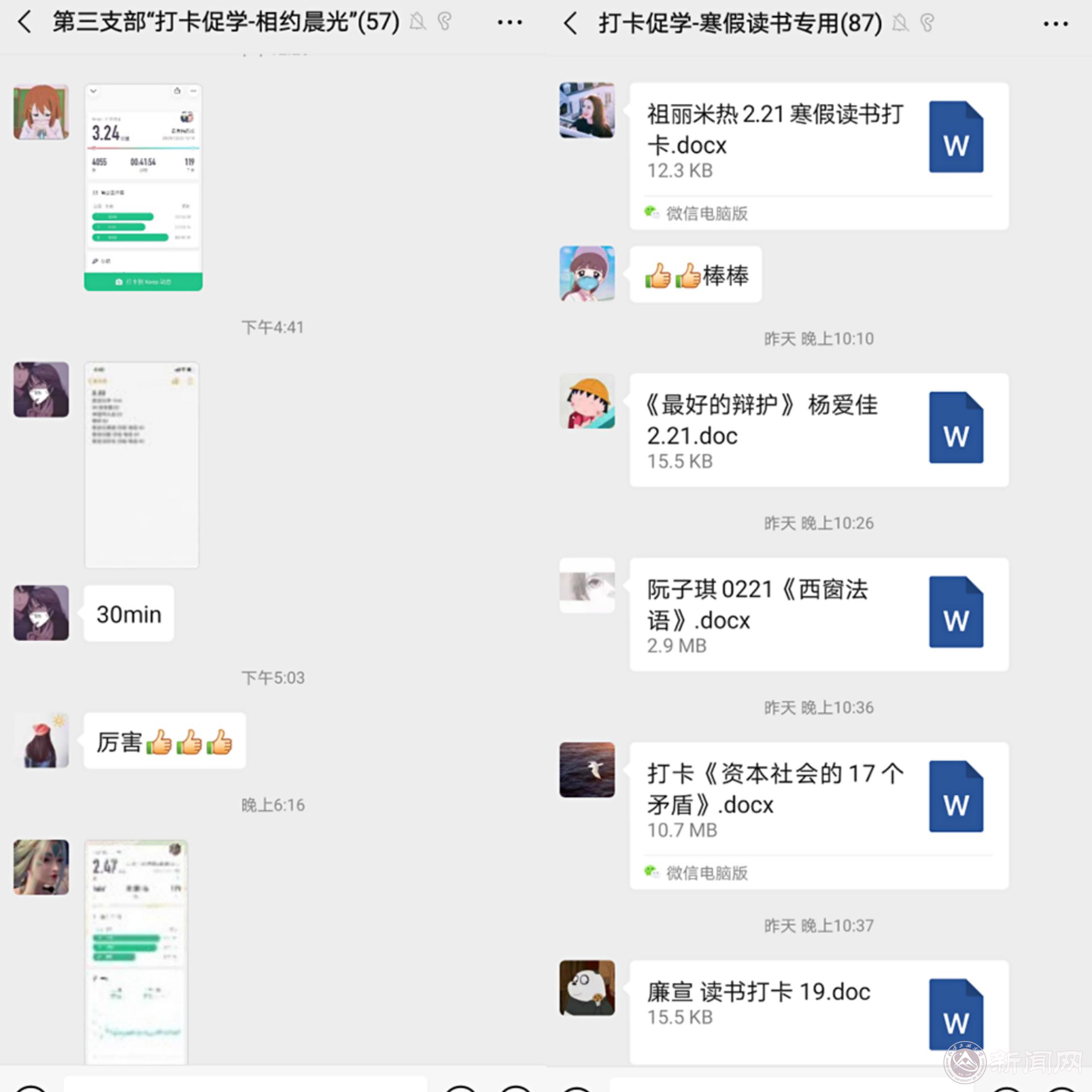 支部开展“打卡促学”活动,引导学生通过打卡方式逐步形成读书、背单词、锻炼等良好习惯,促进学业。为阻断疫情传播,全国上下都需要居家隔离。支部第一时间做好设计,打卡促学是一种能让青年大学生们实现充实、健康、安心居家隔离的好办法。支部微信公众号发出《第三党支部喊大家来读书锻炼啦!》推文,通过微信群打卡方式带领同学们一起读书、锻炼,落实居家隔离。针对法学专业学生的学习特点,支部又推出“法学专业课学习沙龙专题活动——花式学法”,带领法学专业学生采取灵活多样的方式学习法律知识。活动开展至今,同学们读书锻炼、探讨专业知识的热情高涨,还吸引了越来越多支部外同学加入,成效显著。