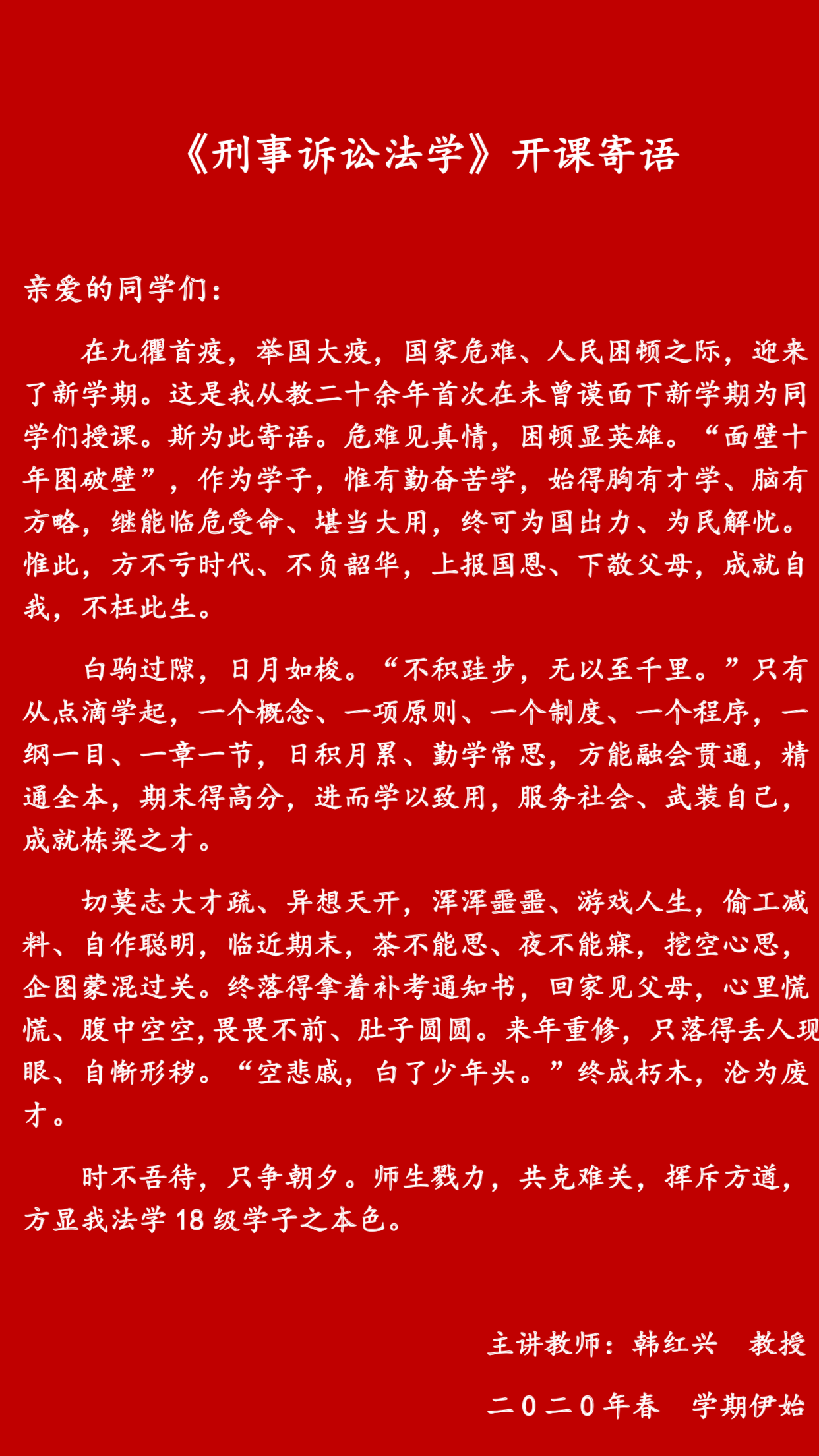 学院精致开展学生思政工作。学院注重将疫情防控和学生思想政治工作紧密结合。法律系韩红兴教授作为法16-1班班导师,坚持每天与学生线上沟通交流,督促同学们做好网络教学准备。韩红兴精心撰写首课励志寄语,激励学生不负韶华,勤学常思,学以致用,服务社会,报效国家。在产权19刑法课堂上,王海桥老师结合当前的疫情防控积极引导同学们思考刑法的社会机能,激发学生的爱国情怀,鼓励大家珍惜难得的幸福时光努力学习。李海燕教授在《中国古代文学史(2)》课堂上,进行思政教育。在讲授魏晋南北朝文学发生的社会背景时,提到了发生在建安22(公元217)年的一场瘟疫。据学者考证,在这场瘟疫中,当时著名的文人,比如“建安七子”中,就有五人染疫而亡,不幸去世。这场瘟疫持续了很长时间,致使人口减半,社会经济严重倒退。在兵荒马乱的汉末,国家没有能力来控制这样的灾难。眼下,我国的疫情已经得到了颇有成效的控制,我们已经看到了胜利的曙光,再次证明:我们中国特色社会主义制度集中力量办大事的优越性,我们能够有效应对前进道路上的各种风险和挑战。