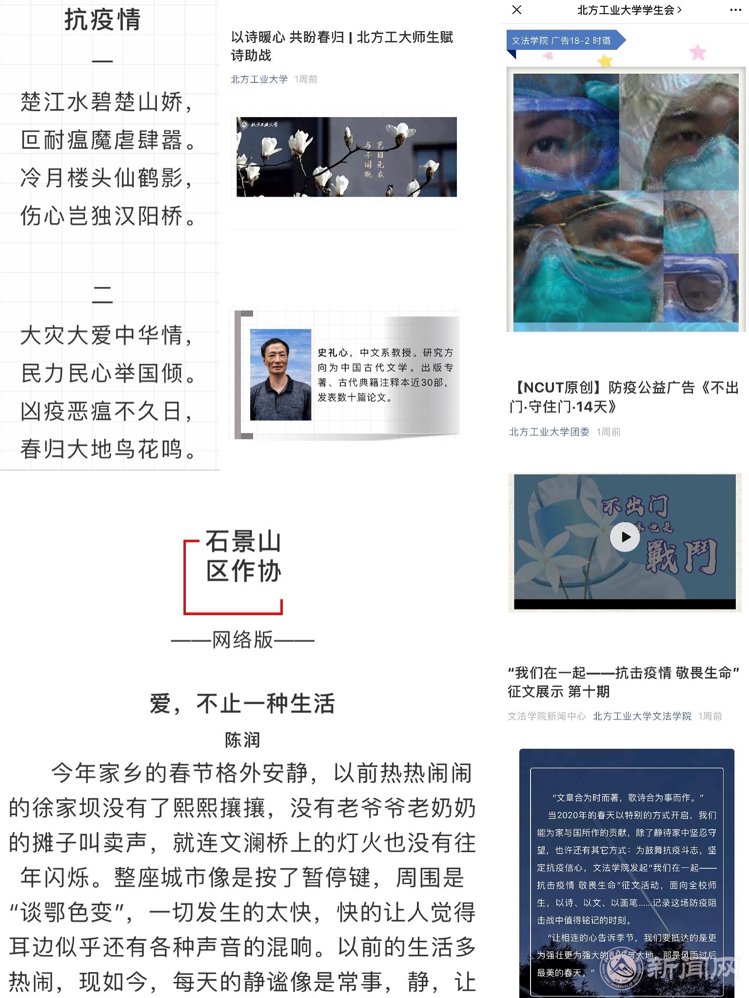 学院团委对投稿作品及时分类、筛选,优秀稿件陆续通过学院微信公众号予以宣传,已完成11期主题推送,得到了学院师生的积极转发,累计阅读量超万次,学校官微、网站和防控工作简报都进行了宣传和报道。同时,学院也积极将优秀稿件向社会公开发行的报刊、媒体推荐发表,其中得到石景山作家协会公众号连续5次转发,进一步扩大了作品的覆盖面和影响力。