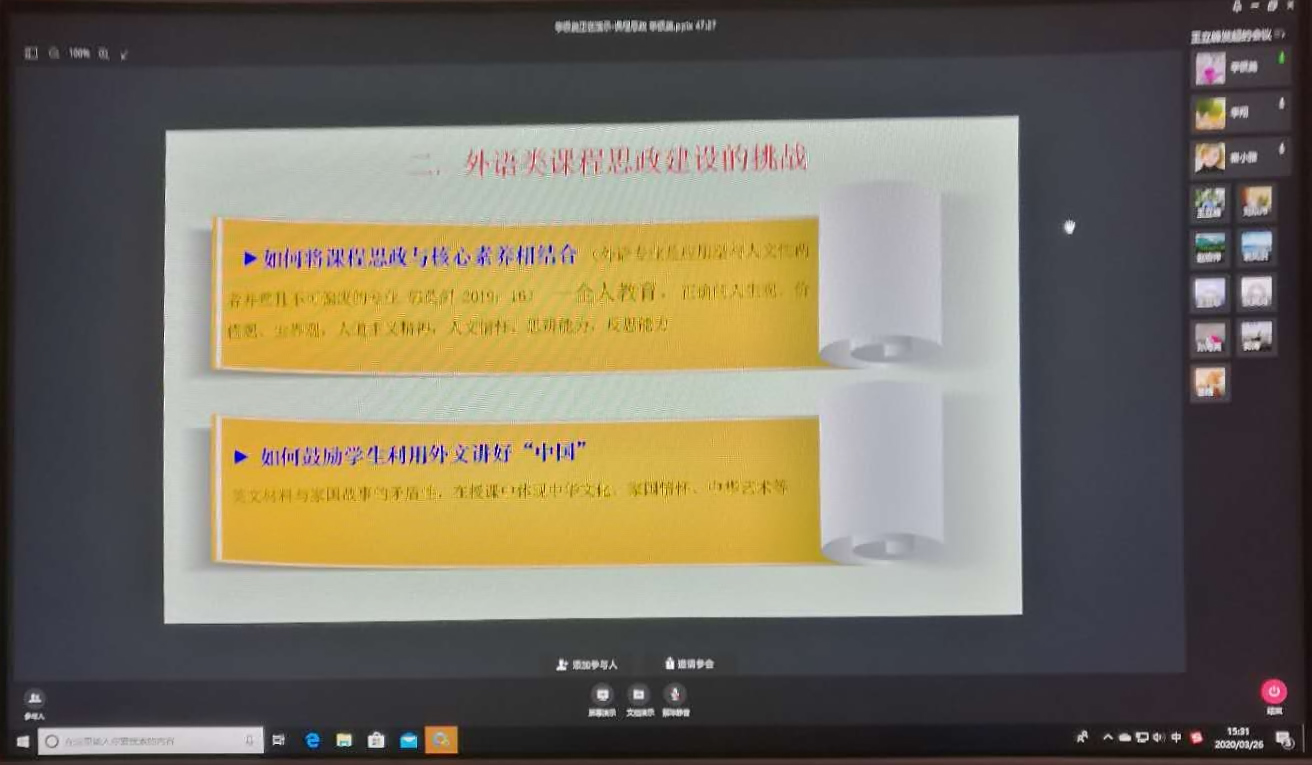 根据学校教务处和威尼斯886699关于课程思政文件精神以及相关工作安排,2020年3月26日下午,威尼斯886699外语教师党支部组织全体党员教师围绕外语专业本科课程思政问题开展了在线交流研讨。会议邀请了我校马克思主义学院刘以沛老师、威尼斯886699袁凤识副院长、英语系秦小雅主任参会。