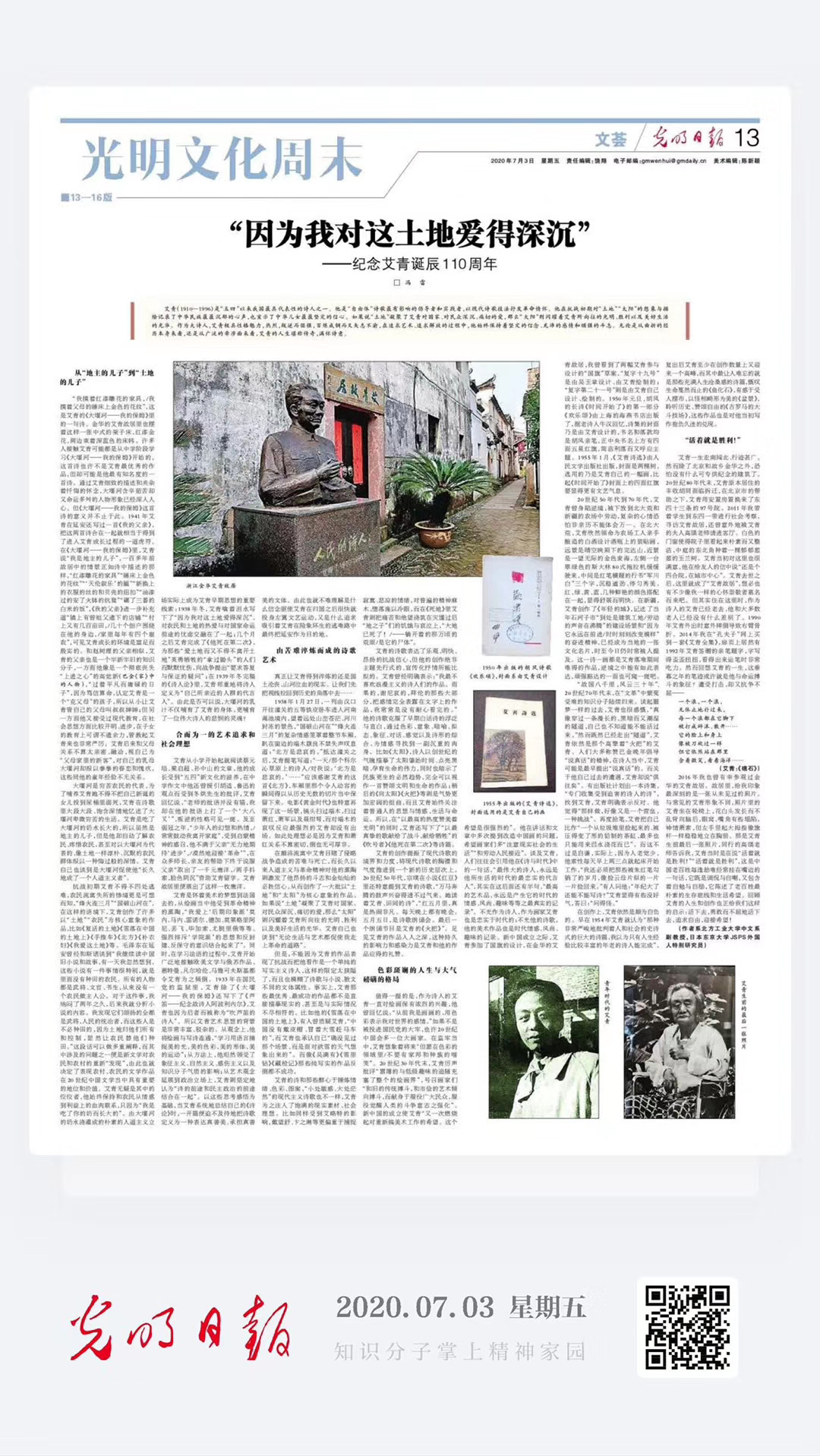 近日,中文系冯雷副教授的文章《“因为我对这土地爱得深沉”——纪念艾青诞辰110周年》被“学习强国”转载。原文于2020年7月3日以整版的形式发表在《光明日报》上。