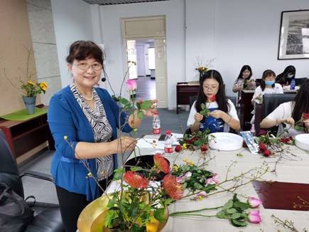 讲座中,滕军老师就花道文化的起源、发展以及象征意义进行了生动讲解,指导每一位学生完成花道作品并对其进行修改。讲座后,滕军老师还就学生们提出的问题进行了耐心解答。学生们在此次讲座中展现出了强烈的学习兴趣,积极踊跃参与实践,在场学习气氛十分浓厚。
