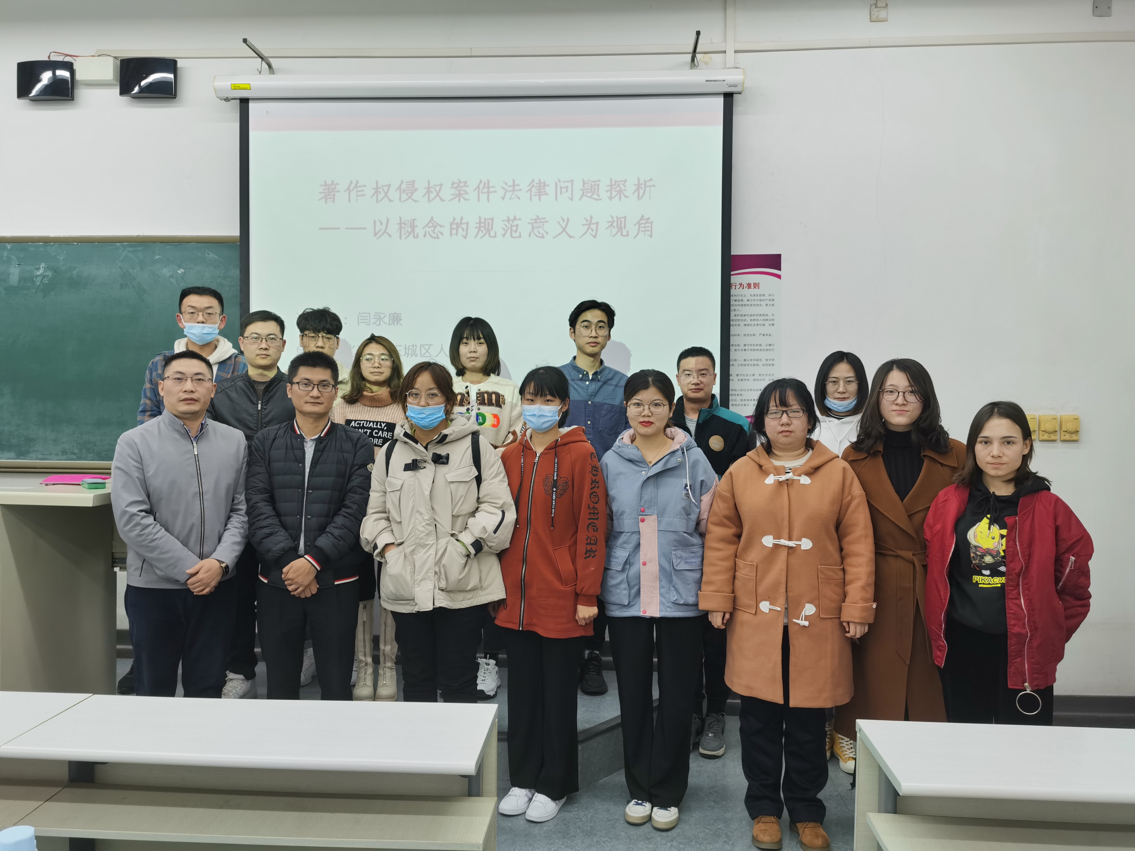 此次授课议题为“著作权纠纷案件审判实务问题探析——以概念的规范意义为视角”。课程伊始,闫法官结合著名的“‘歼十’模型著作权案”为同学们梳理了著作权案件审理思路;通过经典的“猩猩拍照”、“‘汉高断蛇之处’碑案”、“第九套广播体操案”等案例使同学们对于“作品”的法律含义有了更深的理解,课程内容丰富,分析入理。课程尾声,针对同学们在本课程中遇到的疑惑,闫法官一一作了详细的解答。最后法律系邓恒副教授对本次课程内容提出了自己的看法,并与闫法官进行了简单的探讨。