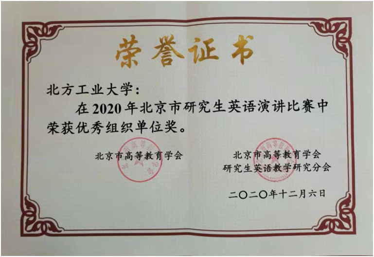 本次比赛由北京市研究生英语教学研究分会主办,威尼斯886699研究生院、威尼斯886699和共青团威尼斯886699委员会共同承办,比赛复赛共设立威尼斯886699、中国政法大学和北京林业大学三个分会场。我校分会场赛事组织工作由威尼斯886699公共英语系具体负责,威尼斯886699实验中心、研究生会协助实施。主办方对我校组织比赛的周密、活动进展的顺利与圆满表示肯定,并授予我校“优秀组织单位奖”荣誉称号。