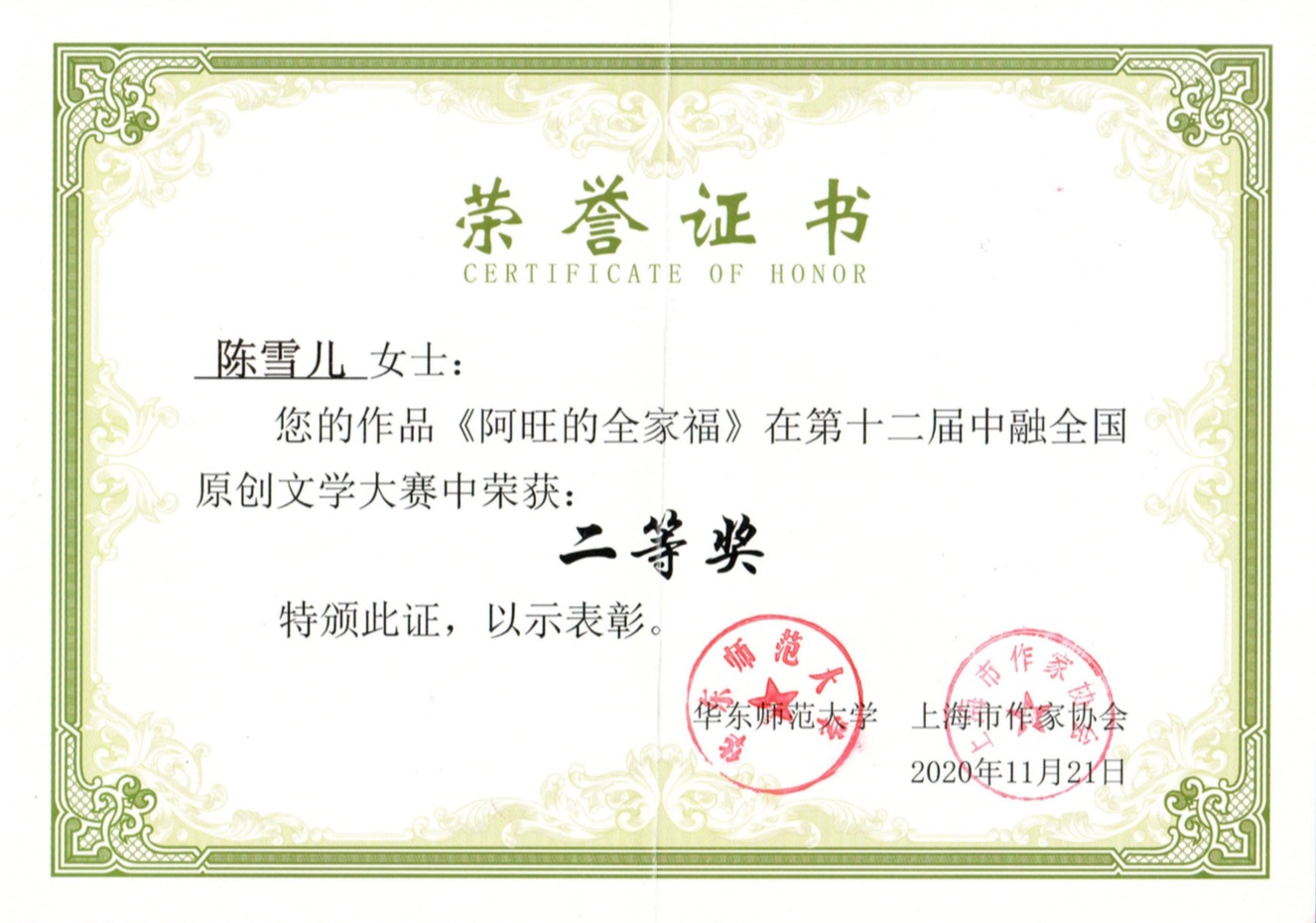 中融全国原创文学大赛是全国性的原创文学赛事,本次比赛设置一等奖1名(奖金10000元)、二等奖2名(奖金5000元)、三等奖3名(奖金3000元),共收到来自26个省市的文学作品两千余篇。陈雪儿在董树宝教授的悉心指导下确定选题,反复打磨参赛作品,数易其稿,经过激烈角逐和三轮严格审核,最终获得二等奖。