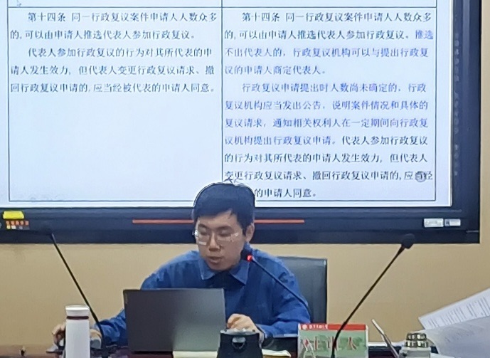 2022级研究生韩泽作为主讲人,围绕《行政复议法(修改草案)》提出了三个方面的修改建议。第一,建议确立“行政复议前置为原则、直接诉讼为例外”模式。第二,建议在立案环节以申请登记制替代申请审查制。第三,建议完善行政复议委员会制度。韩泽收集整理了诸多实证数据,对以上三个方面的修改意见展开了系统论证。